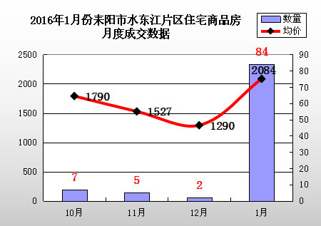 2016年1月,耒阳水东江区住宅商品房成交84套,交均价为2084元/㎡, 东城·悦龙湾成交79套位居冠军,荷塘月色成交5套,本月是水东江有史以来,成交均价及成交量最高的。 |